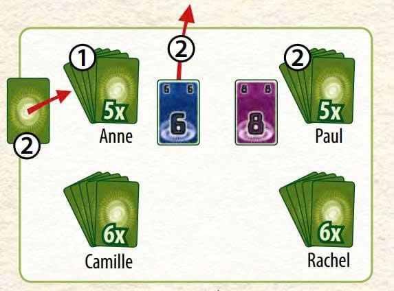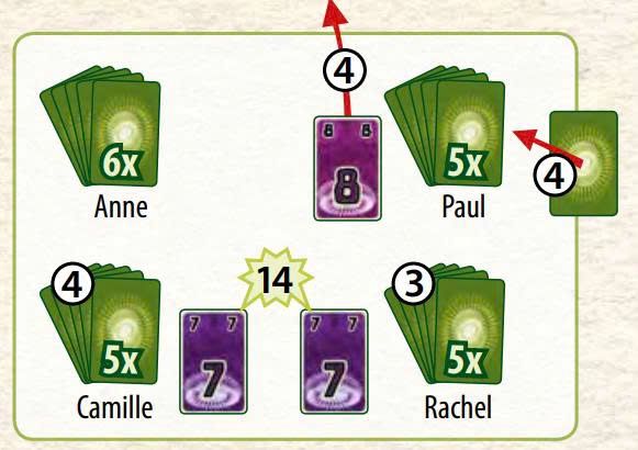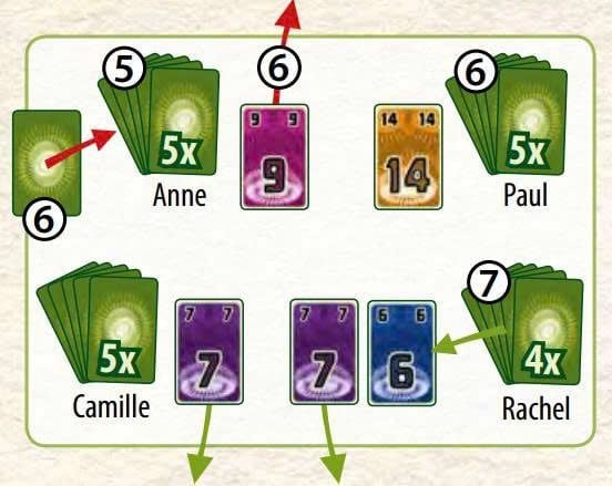 ⑦ Vào đầu lượt của Rachel, cô ấy vẫn còn lá "7" ở trước mặt và "đẩy đi trót lọt". Vì Rachel và Camille đã giúp đỡ nhau bằng cách đánh ra hai lá bài cùng số, cả hai người chơi đều bỏ đi lá số "7" mà không cần phải rút bài thay thế. Họ đã bước thêm một bược gần đến chiến thắng. Sau đó Rachel đánh ra lá số "6" và chỉ còn 4 lá bài trên tay cô ấy.