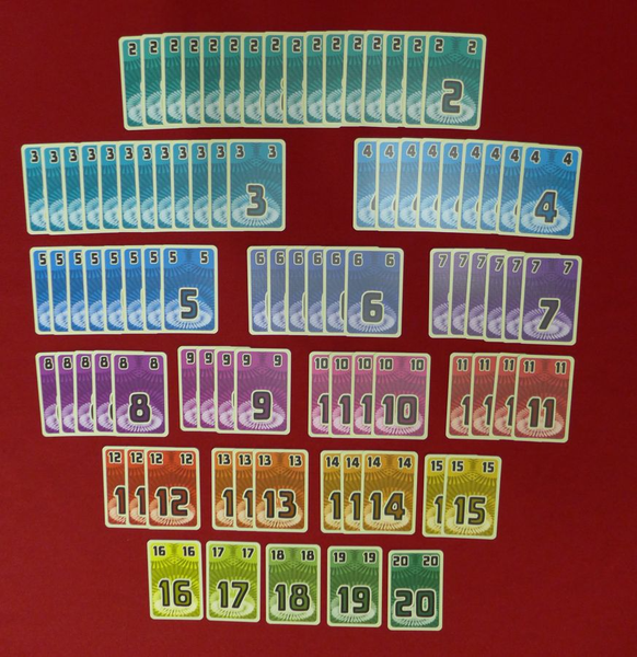 90 lá bài (16x 2", 12x"3", 9x"4", 8x"5", 6x"6" to "7", 5x"8" 4x"9" to "11", 3x"12" to "14", 2x"15" 1x"16" to "20")