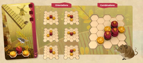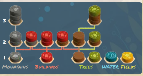 - Nó có thể được đặt trên đỉnh của 1 hoặc 2 token đã đặt trước đó để tạo ra Cây (Trees), Tòa Nhà (Buildings), hoặc Núi (Mountains) (như hình minh họa bên dưới).