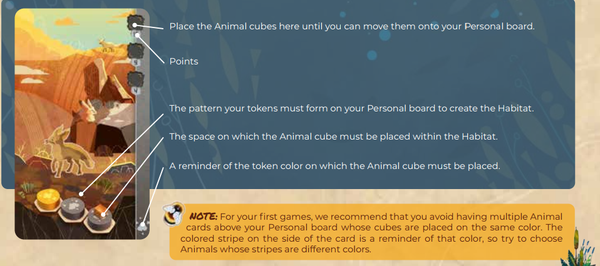 LƯU Ý: Đối với những ván đầu tiên, chúng tôi khuyên bạn nên tránh có nhiều Thẻ Động Vật phía trên Bảng Cá Nhân của mình mà các khối của chúng được đặt trên cùng một màu. Sọc màu ở bên cạnh thẻ là một lời nhắc nhở về màu đó, vì vậy hãy cố gắng chọn các Động Vật có sọc màu khác nhau.