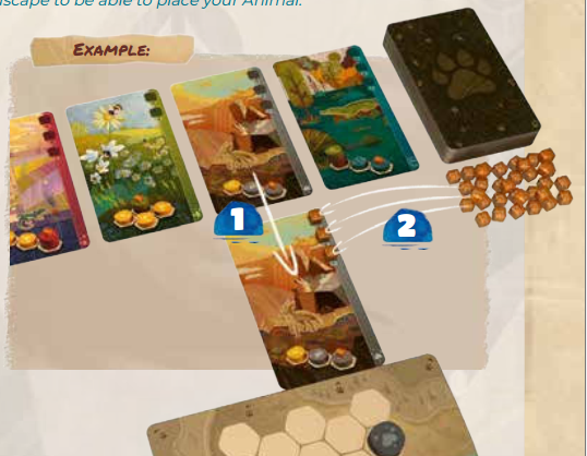 Ví Dụ : Pauline lấy 3 thẻ token (2 màu xám và 1 màu đỏ). Cô ấy đặt các token (1) , điều này cho phép cô ấy đặt một con Cáo Fennec (2)