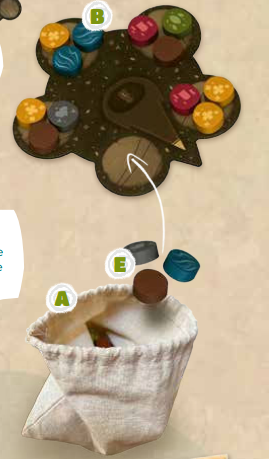 - Lấp đầy mỗi ô trong số 5 ô của Bảng Trung Tâm với 3 token bạn rút ngẫu nhiên từ Túi Vải.