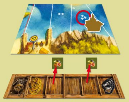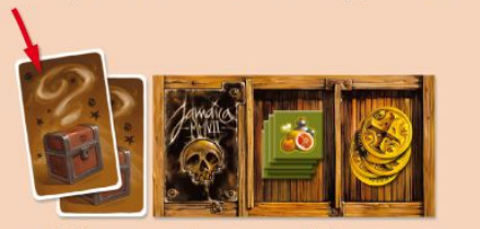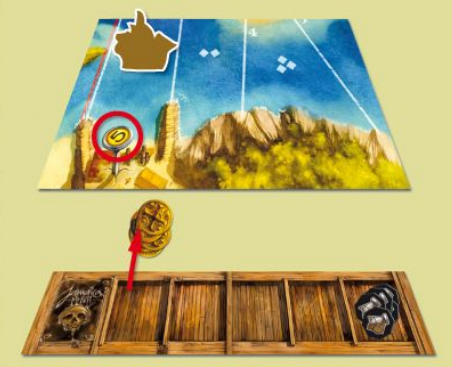 - Chọn ngẫu nhiên 9 trong số 12 thẻ kho báu, xáo trộn chúng và đặt úp mặt vào khoảng trống bên phải hộp định hướng. 3 thẻ còn lại đặt trở lại hộp trò chơi mà không cần nhìn chúng.