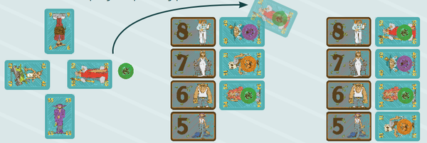 Màu xanh lá cây chơi lá bài cao thứ hai và do đó thắng vòng. Họ đặt ô gia đình của mình lên lá bài thắng và quyết định đặt nó vào đâu trong hệ thống phân cấp. Màu xanh lá cây đặt lá bài Pumafioso của mình bên cạnh bậc phân cấp 8. Màu tím bị đẩy xuống 1 bậc và nhận 1 điểm phạt. Màu cam bị đẩy xuống 2 bậc và nhận 2 điểm phạt.