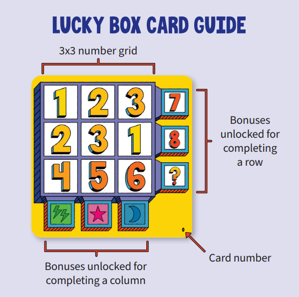 - Sau khi chơi, để phân tách lại các Lá Bài Lucky Box thành 2 bộ riêng, hãy dựa vào các số nhỏ (1-60) được in ở góc dưới cùng bên phải của mỗi lá bài.
