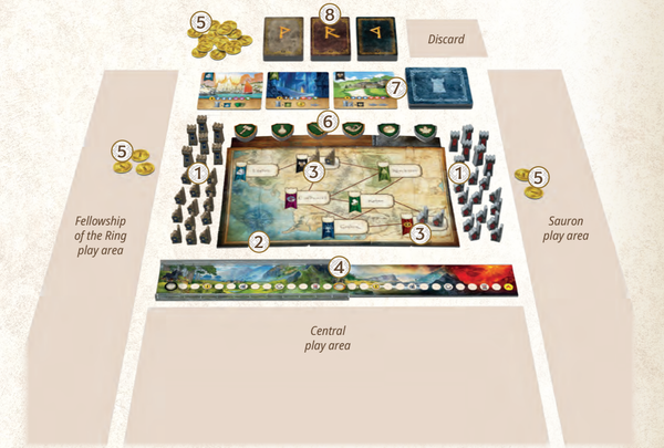 - Người chơi phe Hiệp hội lấy 3 đồng xu (Coins), người chơi phe Sauron lấy 2 đồng xu (Coins). Sau đó, tạo một khu vực dự trữ với số đồng xu còn lại.