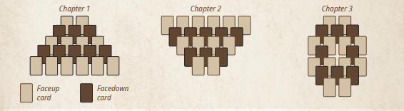 Vào đầu mỗi chương (1, 2, sau đó là 3), hãy đặt các thẻ bài từ chương tương ứng vào khu vực chơi trung tâm (central play area) theo sơ đồ bên dưới. Hãy cẩn thận vì một số thẻ được đặt ngửa mặt và những thẻ khác được đặt úp mặt. Đặt 3 thẻ bài còn lại vào chồng bài bỏ theo chiều úp mặt.