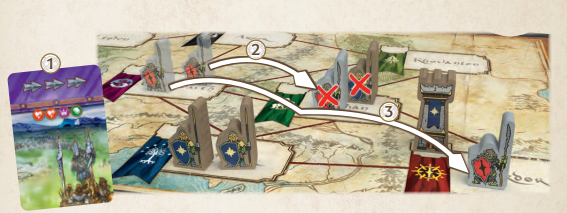 - Nếu có một hoặc nhiều Đơn vị quân thù hiện diện: kích hoạt một cuộc xung đột (conflict). Mỗi người chơi loại bỏ một Đơn vị quân của mình và đặt chúng trở lại trước mặt họ. Lặp lại điều này cho đến khi có ít nhất một người chơi không còn Đơn vị quân nào trong vùng đó.