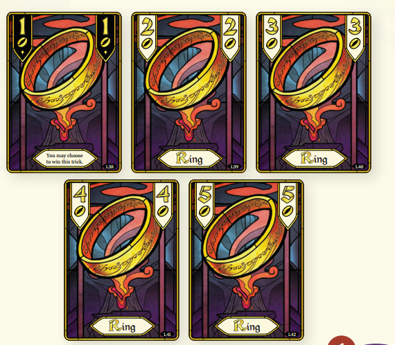 Nhẫn Quyền Năng (The One Ring): Lá bài 1 của bộ Rings là lá bài đơn lẻ mạnh nhất trong trò chơi. Khi một người chơi đánh lá bài 1 của bộ Rings, họ có thể quyết định rằng họ muốn thắng màn Mánh ; nếu họ làm vậy, họ sẽ thắng màn Mánh bất kể những lá bài nào đã hoặc sẽ được đánh vào màn Mánh đó. Nếu họ quyết định không tự động thắng màn Mánh, hãy coi lá bài đó có thứ hạng 1 của bộ Rings. Lá bài 1 của bộ Rings phải tuân theo các quy tắc thông thường khi chơi một lá bài trong bộ Rings.
