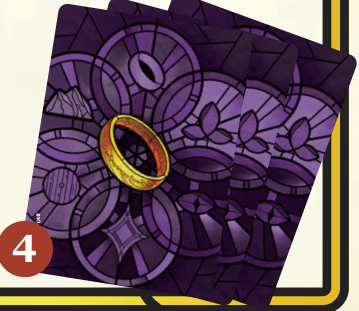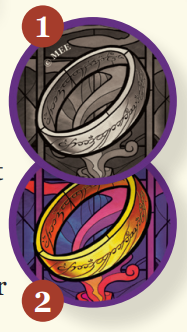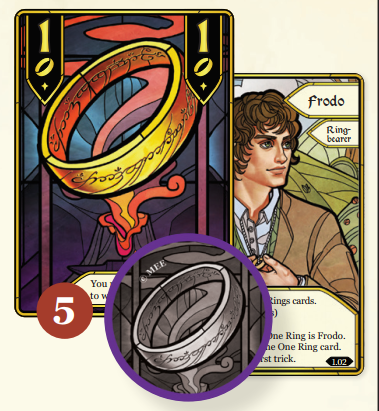 - Tay bài có 1 chiếc Nhẫn lấy Frodo (ở mặt 3 người chơi) và mã thông báo Nhẫn ở mặt Không Thể Dẫn Nhẫn (Cannot Lead Rings Side).