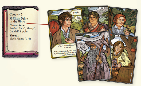 Nếu Frodo không phải là một phần của chương, người chơi được chia lá bài 1 của bộ Rings sẽ chọn một nhân vật trước, sau đó việc lựa chọn sẽ tiếp tục sang bên trái của họ. Người chơi có lá bài 1 của bộ Rings sẽ thực hiện hành động thiết lập của họ trước sau khi mọi người chọn nhân vật. Người chơi được chia lá bài 1 của bộ Rings luôn lấy quân cờ Nhẫn. Hành động thiết lập của một nhân vật sẽ chỉ ra rằng họ dẫn đầu màn Mánh đầu tiên.