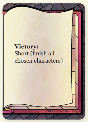 - Dài (Long) "hoàn thành tất cả các nhân vật": Các chương dài sẽ được chơi qua nhiều vòng. Nếu người chơi hoàn thành tất cả các mục tiêu của các nhân vật được chọn, họ sẽ đặt các lá bài nhân vật đó sang một bên. Nếu người chơi chưa hoàn thành tất cả các nhân vật, họ sẽ chơi một vòng khác trong chương này. Một số chương sẽ chỉ ra các nhân vật cụ thể không cần phải hoàn thành.