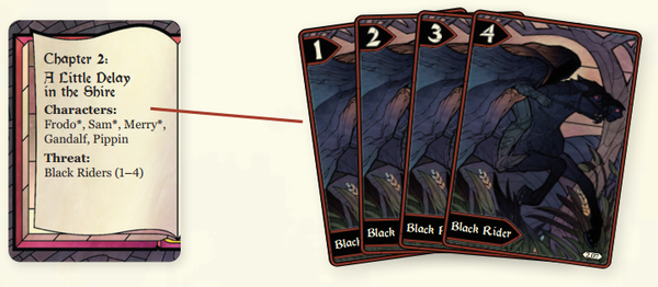 Với mọi số lượng người chơi, bạn sẽ sử dụng Frodo và Gandalf cũng như các lá bài Threat được đánh số $\ge 7$. Sau đó, rút ngẫu nhiên các lá bài dựa trên số lượng người chơi để xây dựng một chương: