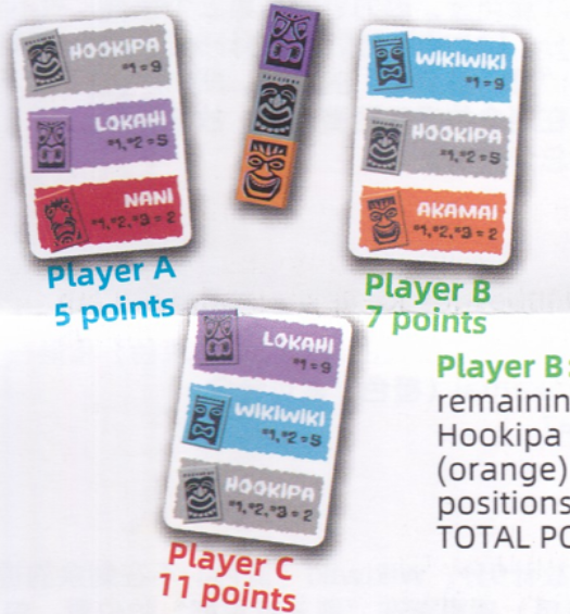 Ghi được nhiều điểm nhất sau một số vòng chơi bằng cách khéo léo sử dụng các lá bài để di chuyển các tượng Tiki bí mật của bạn vào top 3 vị trí theo thứ tự
