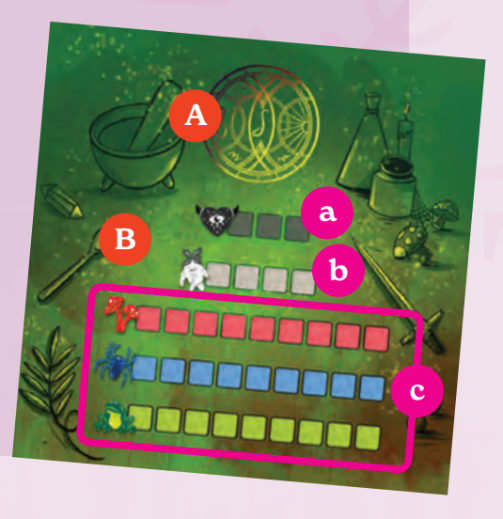 - Cung cấp cho mỗi người chơi một bảng người chơi, một vạc và một thẻ tham chiếu.