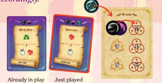 ở đầu thẻ. Mỗi người chơi tăng số đếm trên mã theo dõi Arcana trên thẻ tham chiếu của họ cho bất kỳ biểu tượng Arcana nào trên thẻ công thức mới được lật. Khi một mã theo dõi đạt hoặc vượt qua một số chẵn, được đánh dấu, người chơi có thể kích hoạt hiệu ứng Arcana đó trong lượt đó.